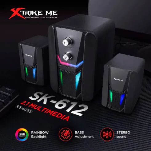 A Caixa de Som Gamer 2.1 RGB Xtrike-ME SK-612 foi projetada para quem busca imersão total em jogos, filmes ou músicas. Com um design moderno e iluminação RGB vibrante, este sistema de som estéreo 2.1 oferece áudio robusto e envolvente, ideal para complementar seu PC ou Notebook.